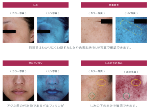2.UV写真撮影:紫外線光を使い、通常の撮影では見えない 薄いシミ・隠れた肝斑・ポルフィリン(アクネ菌の代謝物)など を可視化します